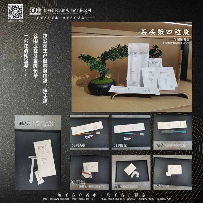 湖北汉康工贸有限公司是维达公司江汉平原(仙桃、天门、潜江、洪湖)特约经销商,长年提供各种高中档餐巾纸、方巾纸、钱包纸巾、盒装纸、擦手纸、卷筒纸、公用卫卷等纸品;筷套、桌布、口布、点菜单、酒水单等印刷单据;床单、被套、枕套、枕芯、云丝被、羽绒被、床垫、方巾、面巾、地巾、浴巾等客房布草;牙具、梳子、香皂、拖鞋、浴帽、洗发液、淋浴液、杂件、清洁用品等一次性客房用品。